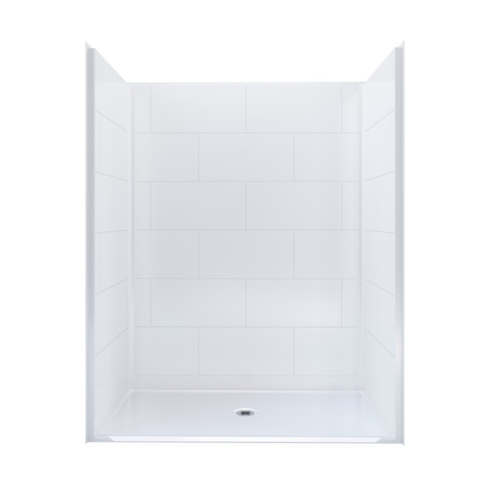 What sets this model apart is its tile-pattern finish. It gives the shower a more finished wall look while keeping the same practical benefits you want in a commercial shower: easy cleaning, fiberglass construction, a 3/4" threshold, a pre-leveled reinforced base, and a textured slip-resistant floor. The center drain layout also keeps the footprint simple and familiar for planning.