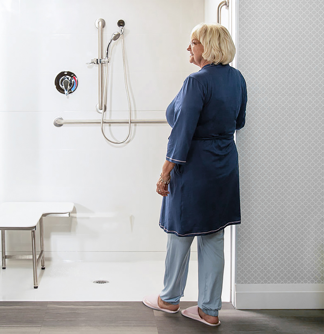 Senior in an ADA Shower in a compliant bathroom